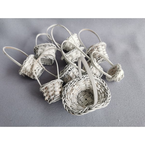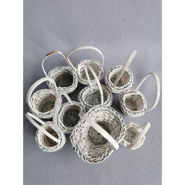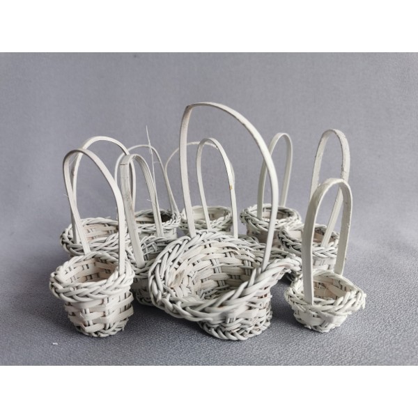 10 ks proutěných košíčků v bílé barvě. Rozměry výška x šířka největšího je 11x8 cm. Nejmenší 7x3,5 cm. Růžné tvary. Z oušek se odlupuje bílá barva. VÝPRODEJ.