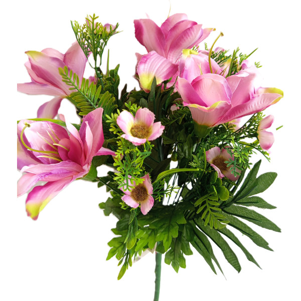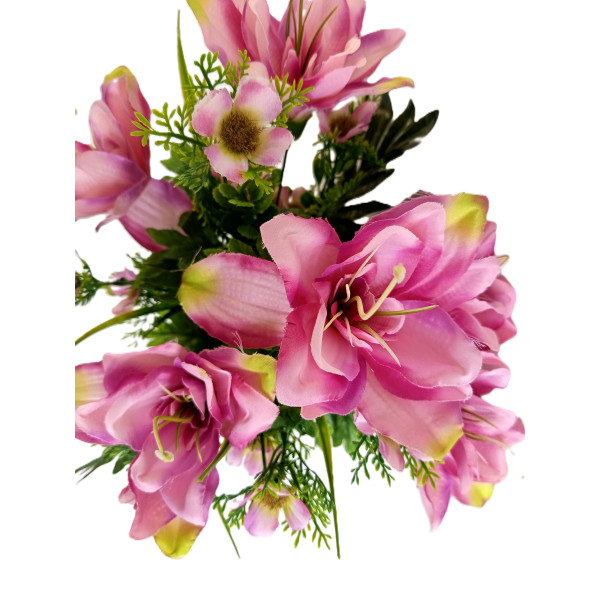 Nově naskladněno. Amarylist kytice s přízdobou a palmovými listy; 5 květů amarylisu + drobné květy + bohatá přízdoba. V. 45 cm; květ 10 cm.