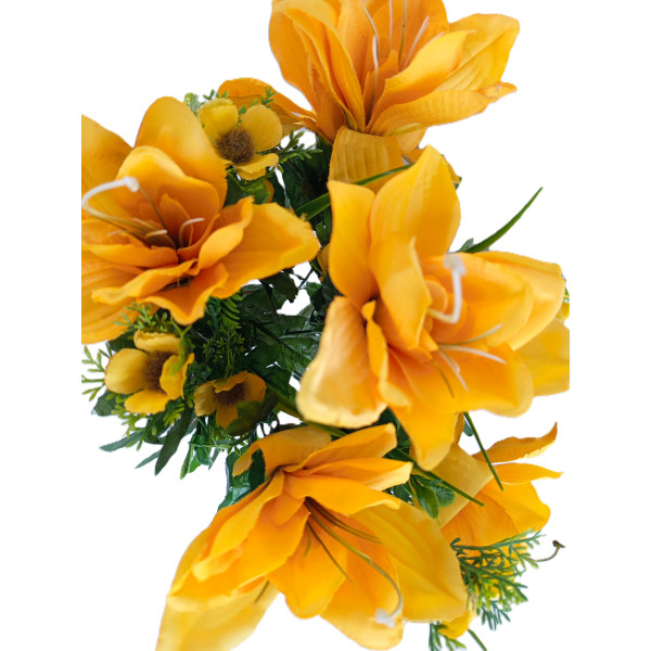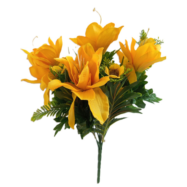 Nově naskladněno. Amarylist kytice s přízdobou a palmovými listy; 5 květů amarylisu + drobné květy + bohatá přízdoba. V. 45 cm; květ 10 cm.