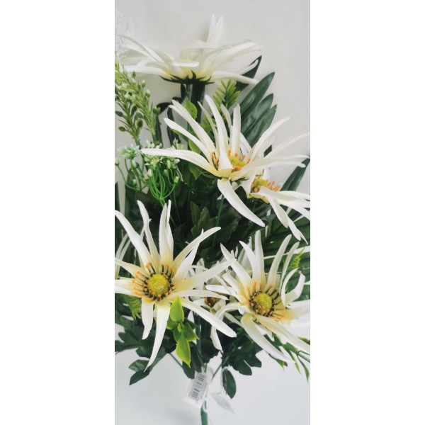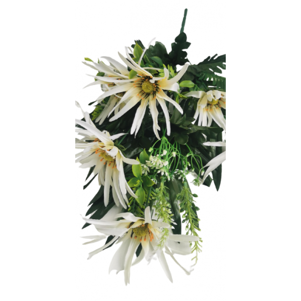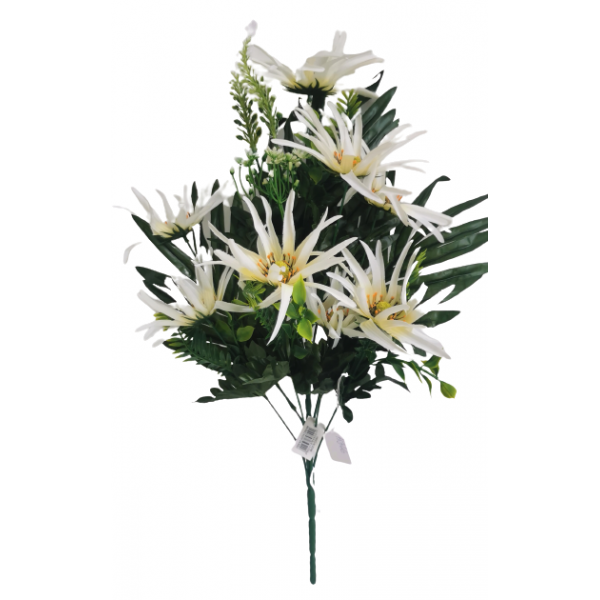 Chryzantéma kytice střapatá s palmovým listem. V. 49 cm; x 10 stonků; 8 květů; šířka květu v nažaženém stavu 14 cm.