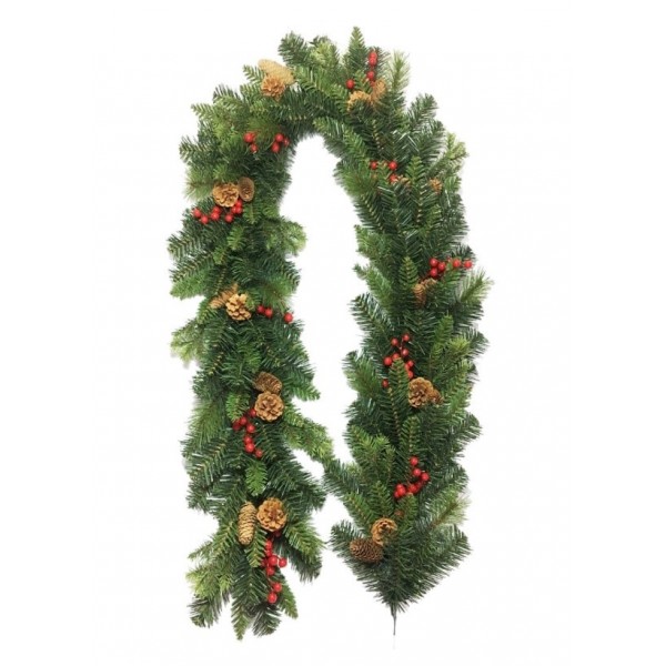 Girlanda chvojová zdobená - šišky a červené bobule. Délka 200 cm. Stejný typ jako věnec č. art. 530-0068. Při odběru více kusů, možná sleva.