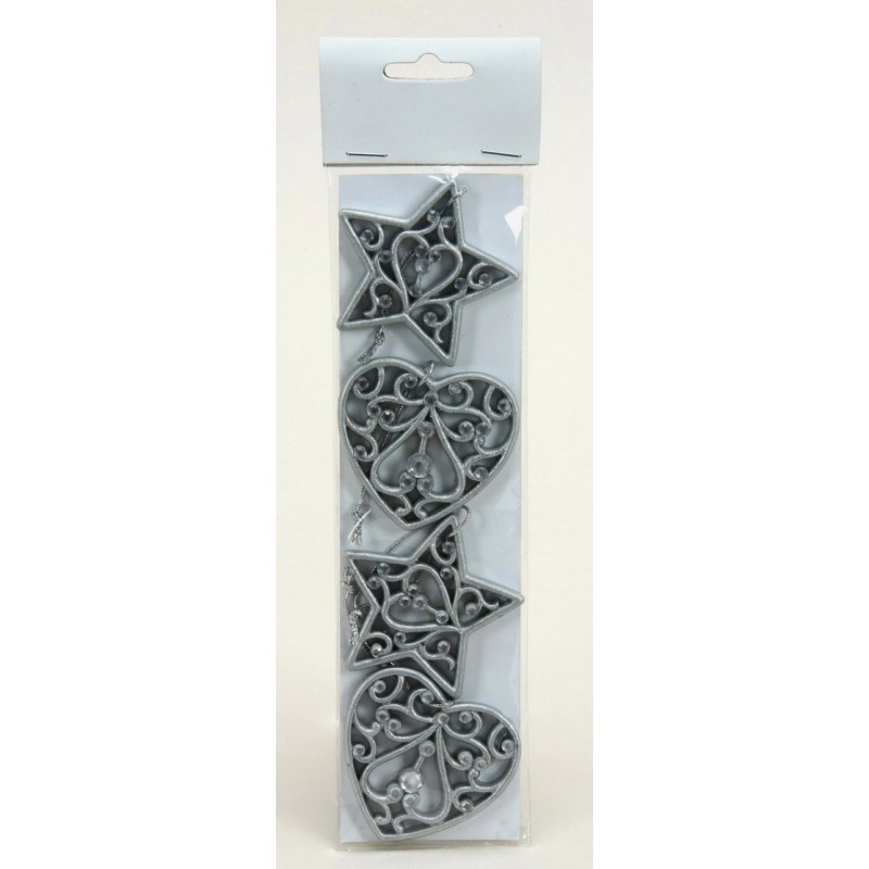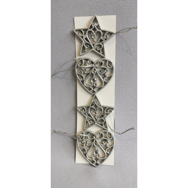 závěsná vánoční dekorace starostříbrná polystone s kamínky; za tuto cenu sáček 4 ks; 2x srdce + 2x hvězda; vel. 6 cm