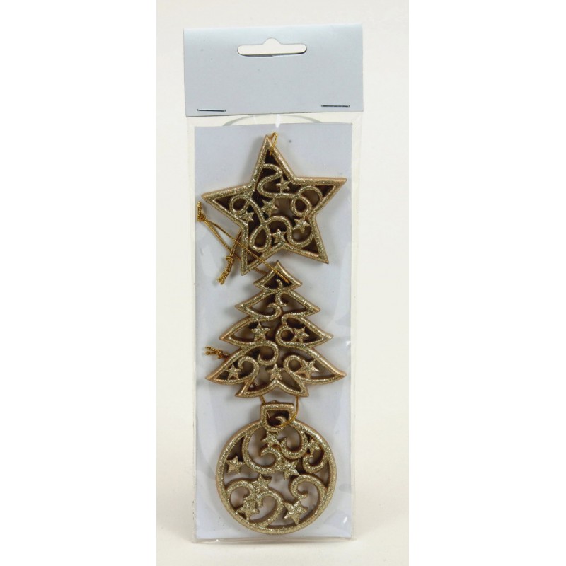 závěsná vánoční dekorace starozlato polystone s kamínky; za tuto cenu 3 ks v sáčku (dle obrázku); srdce, hvězda, vánoční koule; vel. 6 cm