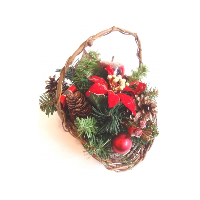 košík zdobený - červ.poinsettie, šišky, bobule, plast.koulička; rozměry: 22*20 cm; POSLEDNÍCH PÁR KUSŮ