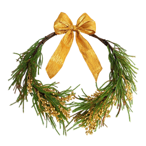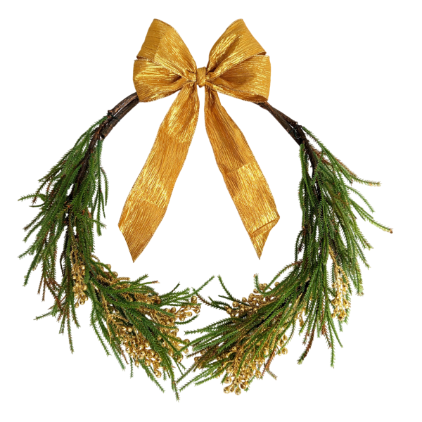 Vánoční dekorace chvojí se stříbrými bobulkami a mašlí. Průměr cca 38 cm, mašle 15 cm. Jedná se o "polověnec" - jsou spojené 2 větve proti sobě, dole nesvázané. Dekorujeme z našich produktů - konkrétně z větve č. 530-0037 a mašle WCT-20-9S-A.