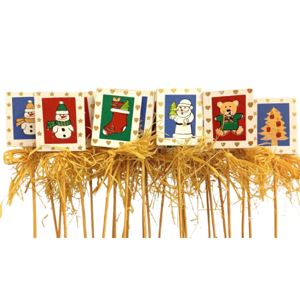 Vánoční dekorační dřevěný zápich - mix veselých motivů v různých barvách, obdélník 4x5 cm.