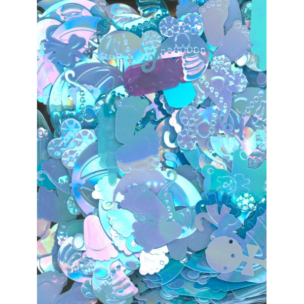 Flitry MIX tvarů modrá AB. Tvary: deštník, medvídek, lahvička, mašle atd. Rozměry: 14 - 24 mm v balení 100 g.