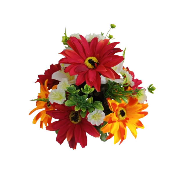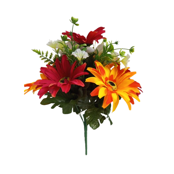 Gerbera kytice x 12 stonků / 7 květů gerber + přízdoba; v. 35 cm, květ prům. 11 cm.