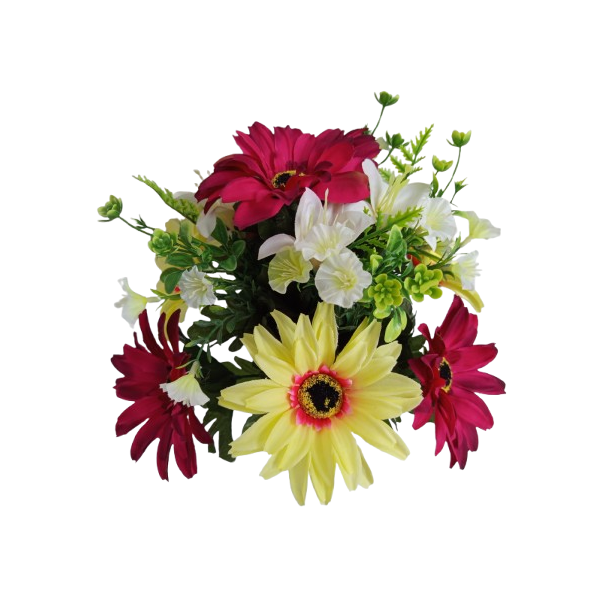 Gerbera kytice x 12 stonků / 7 květů gerber + přízdoba; v. 35 cm, květ prům. 11 cm.