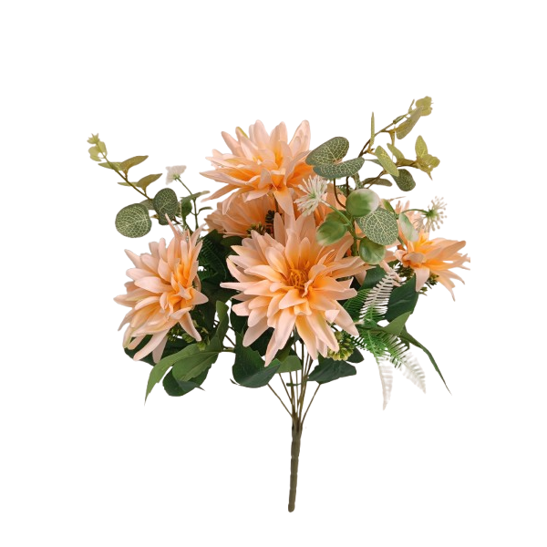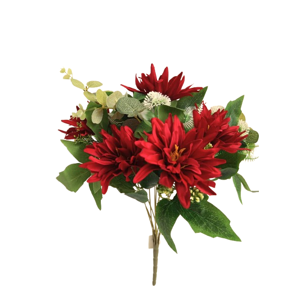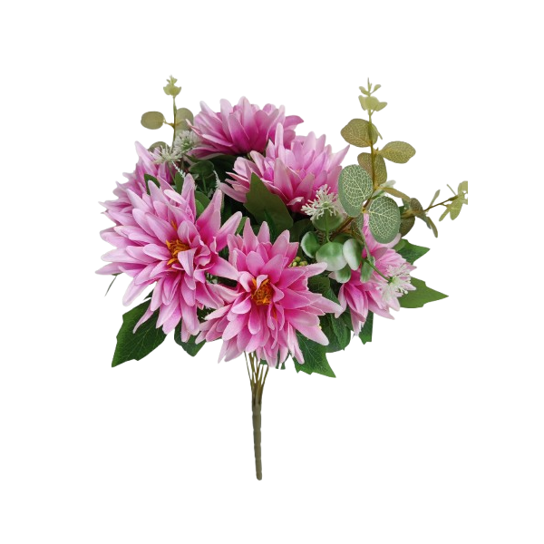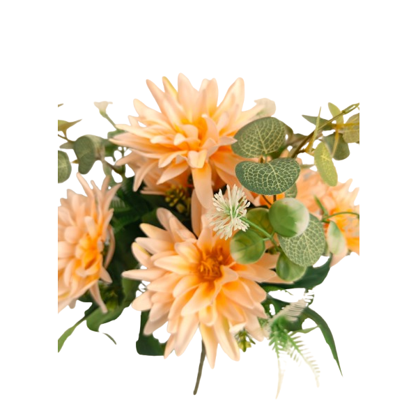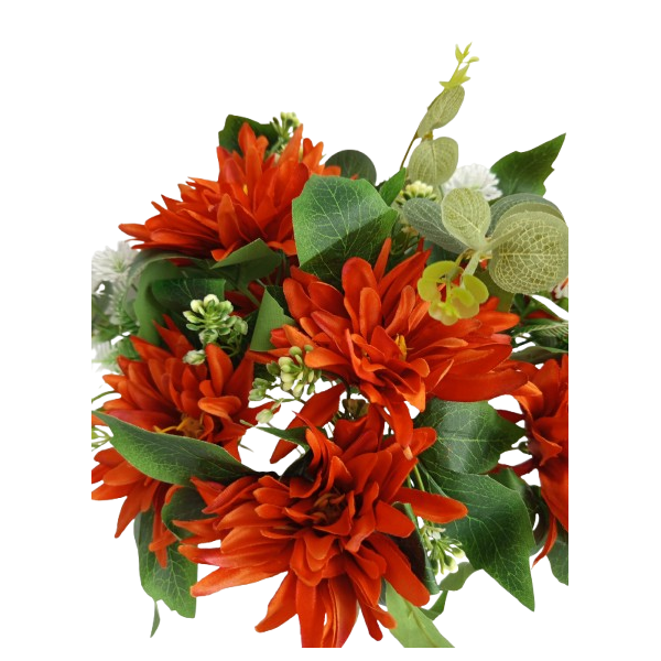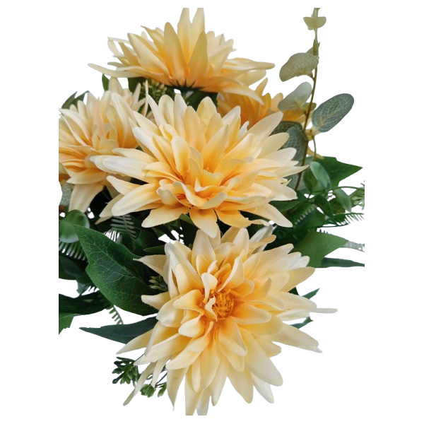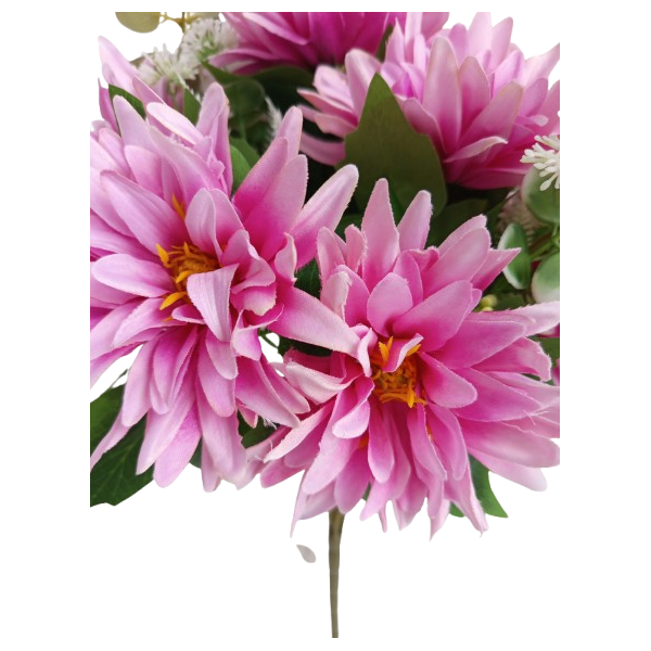 Kytice gerbera s přízdobou. Materiál plast a textil. Výška 46 cm; 10 stonků, 7 květů (prům. 11 cm) + přízdoba. Velmi pěkné.
