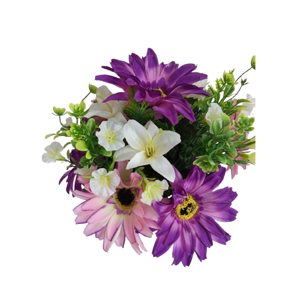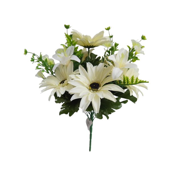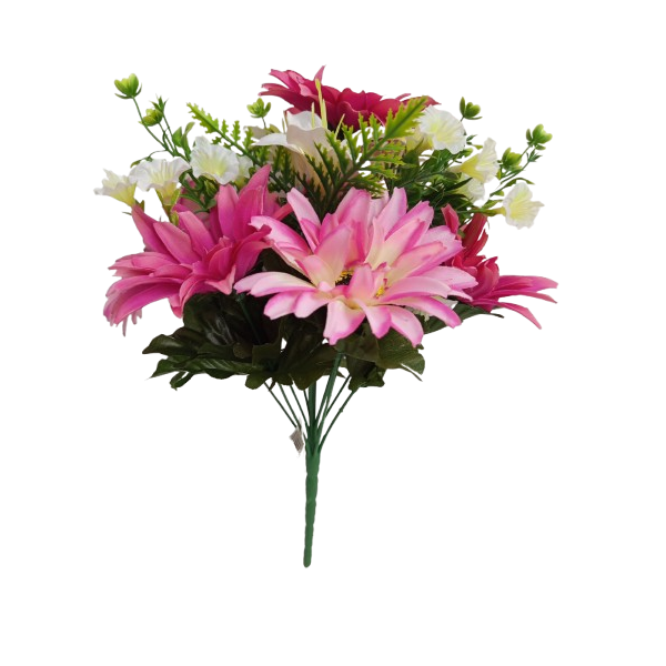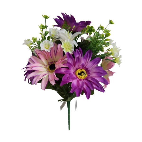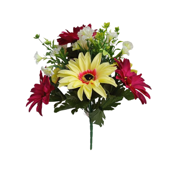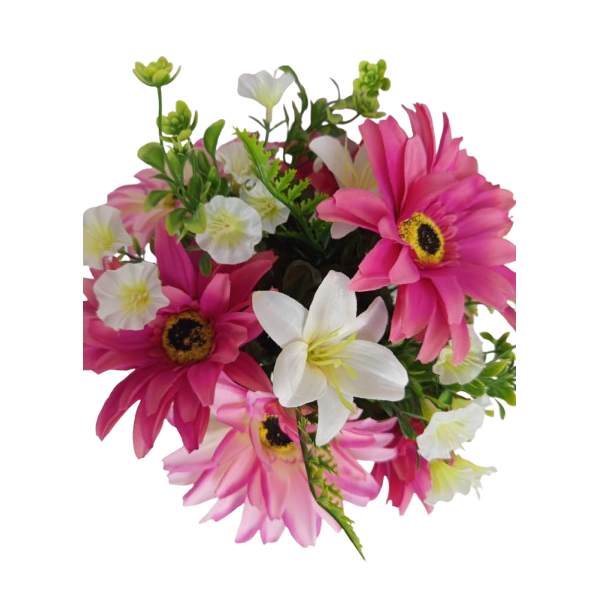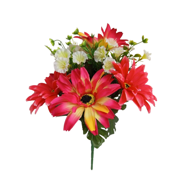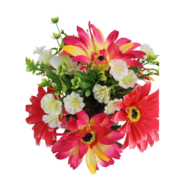 Gerbera kytice x 12 stonků / 7 květů gerber + přízdoba; v. 35 cm, květ prům. 11 cm.