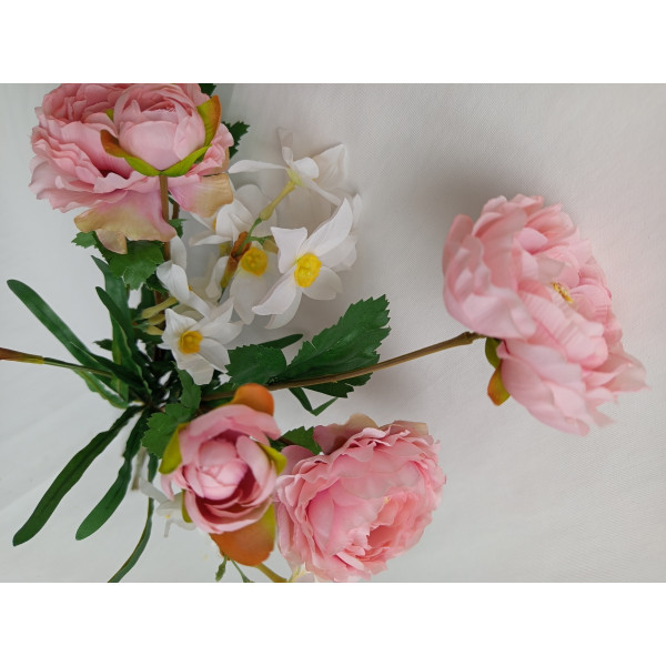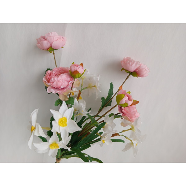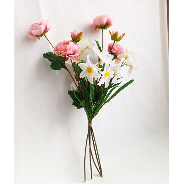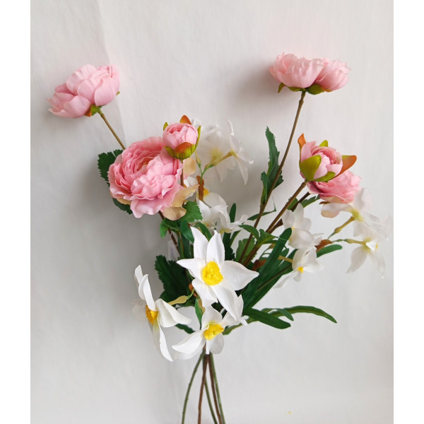 kytice růžovo-bílá; 2x ranunculus, 3x narcis; výška cca 66 cm (možno přizpůsobit zkrácením stonků); velmi pěkná kytice svázaná dohromady rovnou do vázy