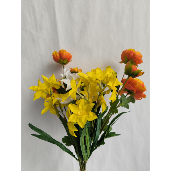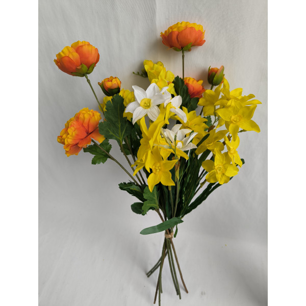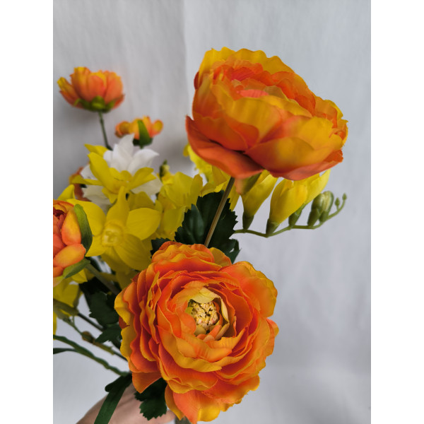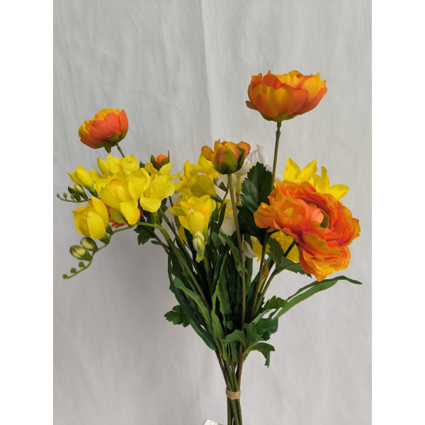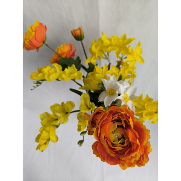 kytice žluto-oranžová; 2x ranunculus, 4x narcis, 2x frézie; výška cca 65 cm (možno přizpůsobit zkrácením stonků); velmi pěkná kytice svázaná dohromady rovnou do vázy