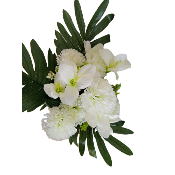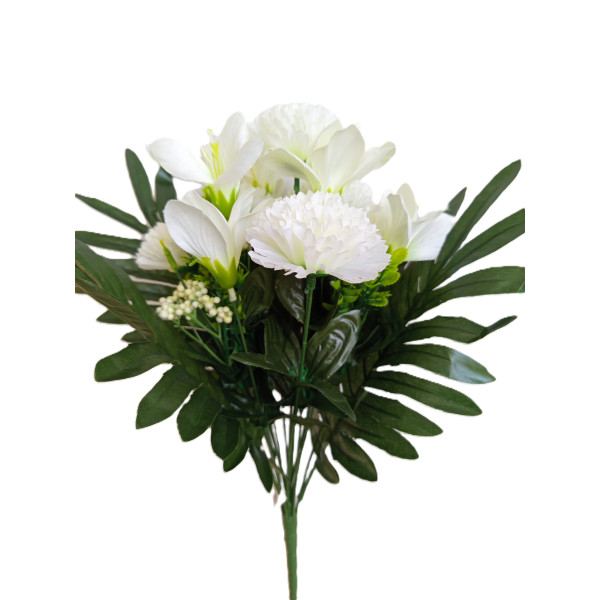 Kytice smuteční s karafiátem, lilií, přízdobou a 3-mi palmovými listy, výška 45 cm; velikost květu karafiátu 7 cm; 6 barev; nové zboží; pěkné