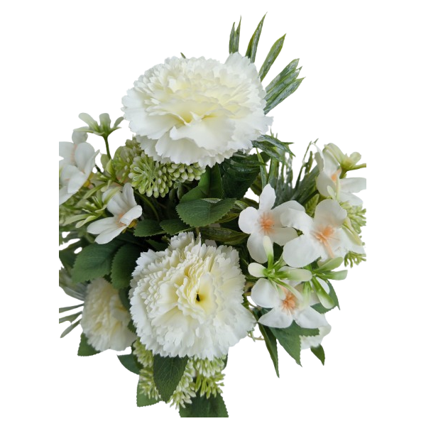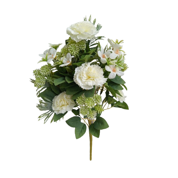 Kytice z karafiátů (4 květy), bodláků (4 květy) a přízdoby. Materiál plast a textil. Výška 43 cm. Vhodné spíše k položení, ale lze i naaranžovat do vázy. 6 barev.