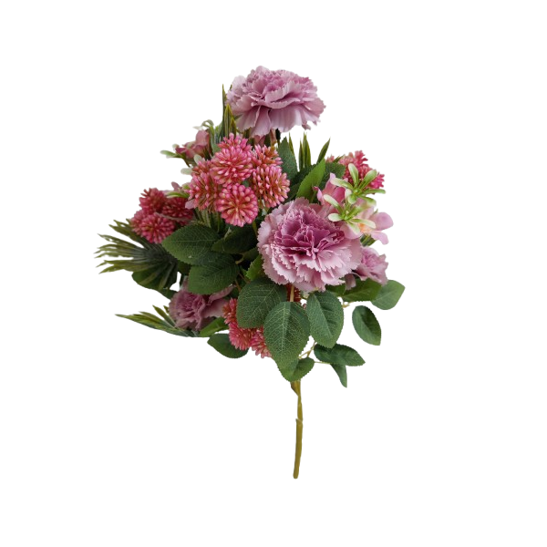 Kytice z karafiátů (4 květy), bodláků (4 květy) a přízdoby. Materiál plast a textil. Výška 43 cm. Vhodné spíše k položení, ale lze i naaranžovat do vázy. 6 barev.