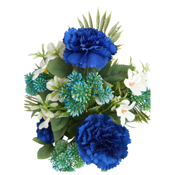 Kytice z karafiátů (4 květy), bodláků (4 květy) a přízdoby. Materiál plast a textil. Výška 43 cm. Vhodné spíše k položení, ale lze i naaranžovat do vázy. 6 barev.