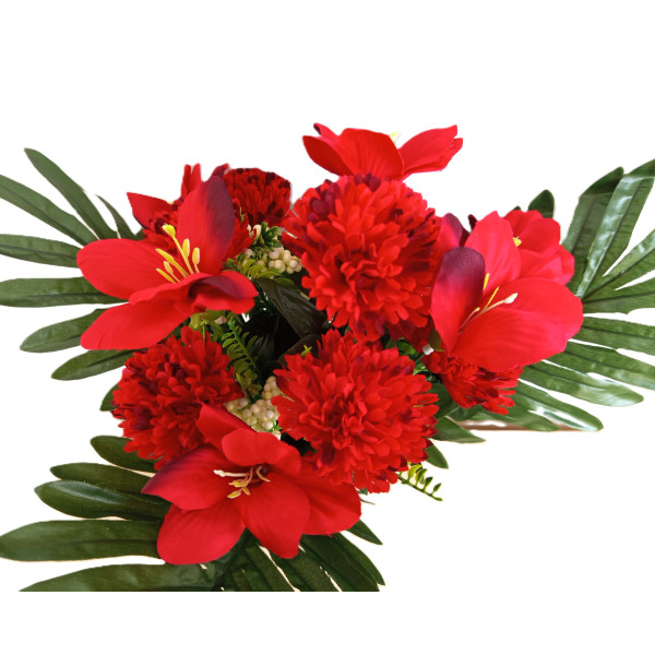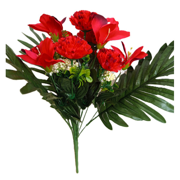 Kytice smuteční s karafiátem, lilií, přízdobou a 3-mi palmovými listy, výška 45 cm; velikost květu karafiátu 7 cm; 6 barev; nové zboží; pěkné