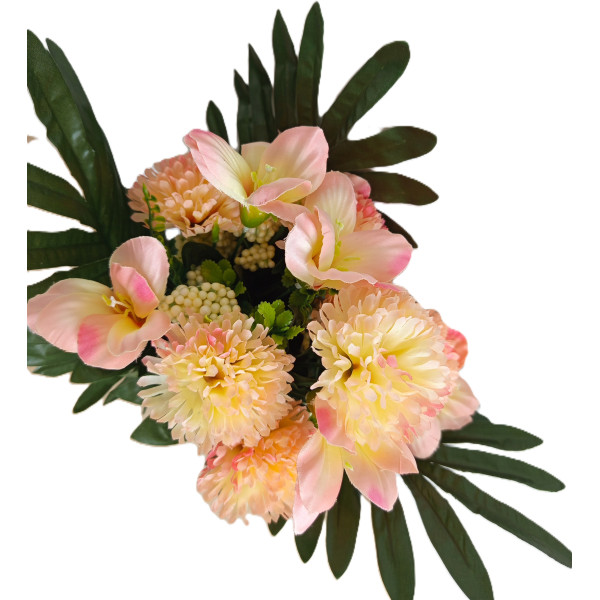 Kytice smuteční s karafiátem, lilií, přízdobou a 3-mi palmovými listy, výška 45 cm; velikost květu karafiátu 7 cm; 6 barev; nové zboží; pěkné