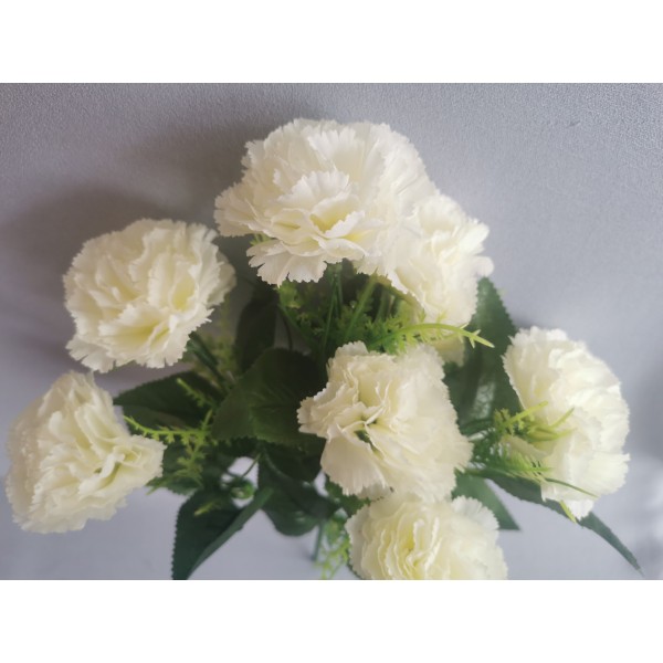 Karafiát kytice x10 (10 květů) s travou; v. 42 cm; květ 6 cm. Ve skutečnosti je kytice více bílá než na fotu.