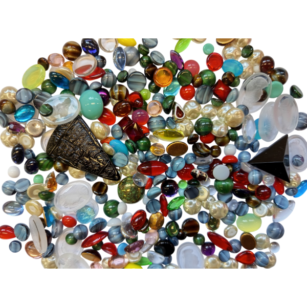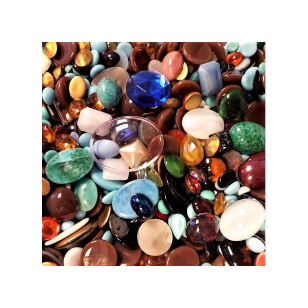 VÝHODNÉ BALENÍ - Skleněné bižuterní mugle, mix kabošonů, různě namixované, foto celku v přepravce, v každém sáčku jsou krásné kameny, některé kameny jsou ve druhé kvalitě. Balení 1000 g.