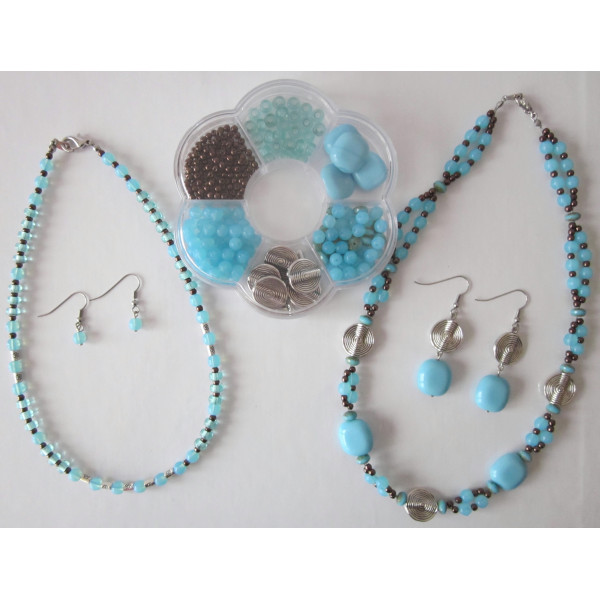 Z této korálkové tvořivé sady lze vytvořit náhrdelník nebo náramky a náušnice. Sada obsahuje: SKLENĚNÉ KORÁLKY v různých barvách a dekorech, KOVOVÉ KORÁLKY, KOVOVÉ KOMPONENTY: lanko na navlékání, karabinka, protikroužek, 4x afroháček na náušnice, 2x nýtek, zamačkávací rokaily. Průměr krabičky je cca 10,5 cm.