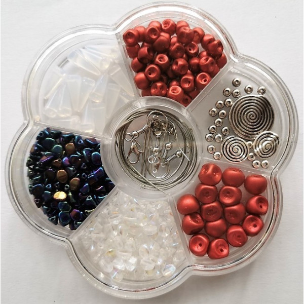 Z této korálkové tvořivé sady lze vytvořit náhrdelník nebo náramky a náušnice. Sada obsahuje: SKLENĚNÉ KORÁLKY v různých barvách a dekorech, KOVOVÉ KORÁLKY, KOVOVÉ KOMPONENTY: lanko na navlékání, karabinka, protikroužek, 4x afroháček na náušnice, 2x nýtek, zamačkávací rokaily. Průměr krabičky je cca 10,5 cm.
