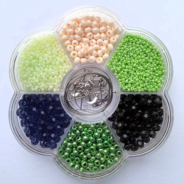 Z této korálkové tvořivé sady lze vytvořit náhrdelník nebo náramky a náušnice. Sada obsahuje: SKLENĚNÉ KORÁLKY v různých barvách a dekorech, KOVOVÉ KORÁLKY, KOVOVÉ KOMPONENTY: lanko na navlékání, karabinka, protikroužek, 4x afroháček na náušnice, 2x nýtek, zamačkávací rokaily. Průměr krabičky je cca 10,5 cm.