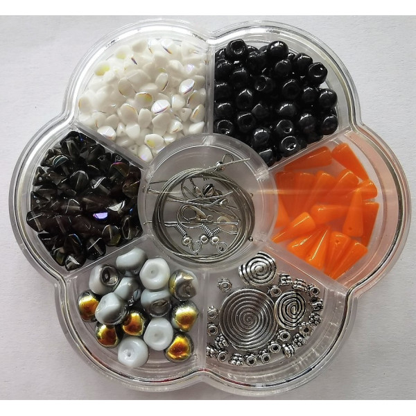 Z této korálkové tvořivé sady lze vytvořit náhrdelník nebo náramky a náušnice. Sada obsahuje: SKLENĚNÉ KORÁLKY v různých barvách a dekorech, KOVOVÉ KORÁLKY, KOVOVÉ KOMPONENTY: lanko na navlékání, karabinka, protikroužek, 4x afroháček na náušnice, 2x nýtek, zamačkávací rokaily. Průměr krabičky je cca 10,5 cm.
