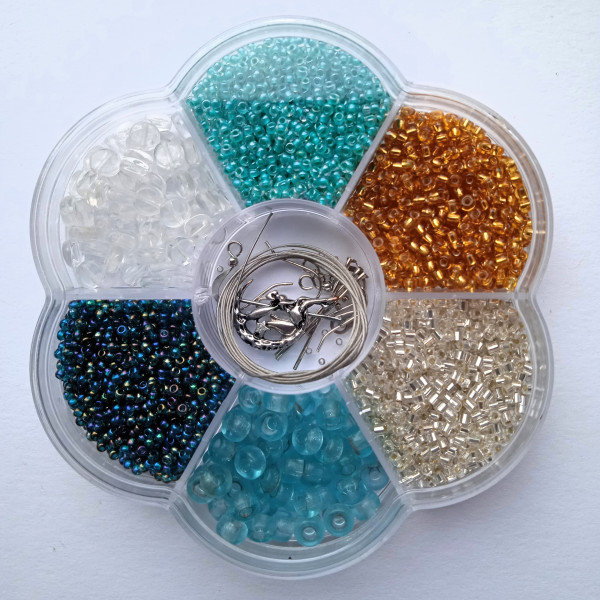 Z této korálkové tvořivé sady lze vytvořit náhrdelník nebo náramky a náušnice. Sada obsahuje: SKLENĚNÉ KORÁLKY v různých barvách a dekorech, KOVOVÉ KORÁLKY, KOVOVÉ KOMPONENTY: lanko na navlékání, karabinka, protikroužek, 4x afroháček na náušnice, 2x nýtek, zamačkávací rokaily. Průměr krabičky je cca 10,5 cm.