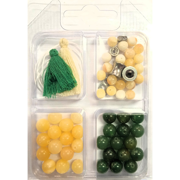 Vše pro výrobu 2 krásných náramků z minerálů dle vlastní fantazie. Obsahuje korálky z minerálů v barvách dle fotografie, 2 nerez štrasové rondelky, 2 nerez korálky, 1 nerez přívěsek, 2 střapce a elastickou lykru. Obdelníková krabička: 75 mm x 110 mm x 15 mm.