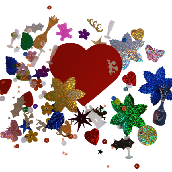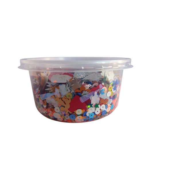 Flitry, mix barev, tvarů a velikostí. Skvělé na tvoření (našívání, lepení, obkreslování nebo aranžmá na párty stůl). Dodáváno v praktické plastové dóze o rozměru cca 11 x 5,5 cm. Obsahuje flitry rovné i prolamované, tvary srdce, lístky, hvězdy, kočárek, nožičky, motýl, kytka, sklenička a mnoho dalších. V každém balení originální mix tvarů a odstínů.