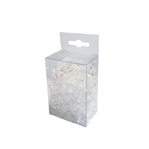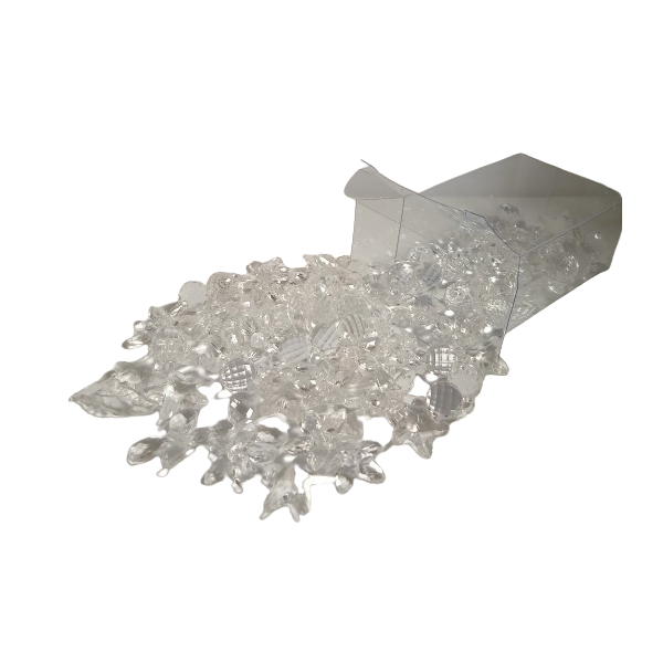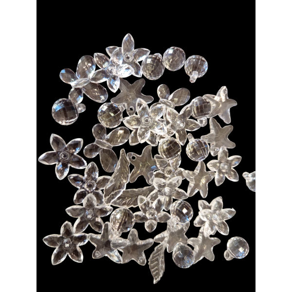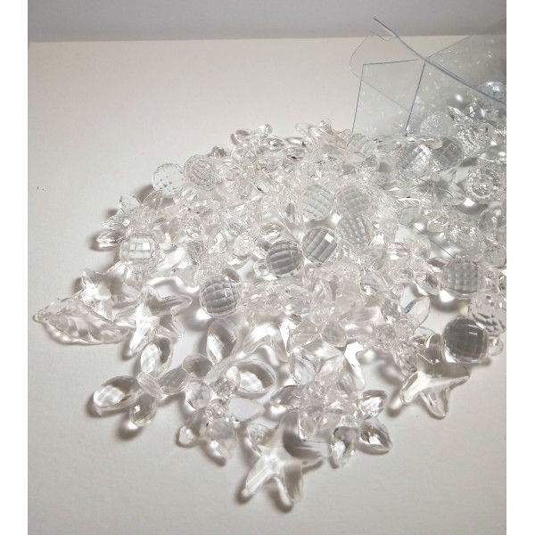 Mix plastových krystalových korálků v průhledné krabičce. Různé tvary - květ, motýlek, kulička, lístek, hvězdice. Obdelníková krabička: 8x5,5x3,5 cm. Váha balení cca 70g, cca 85 ks. Krásné na tvoření různých dekorací, závěsů, atd.
