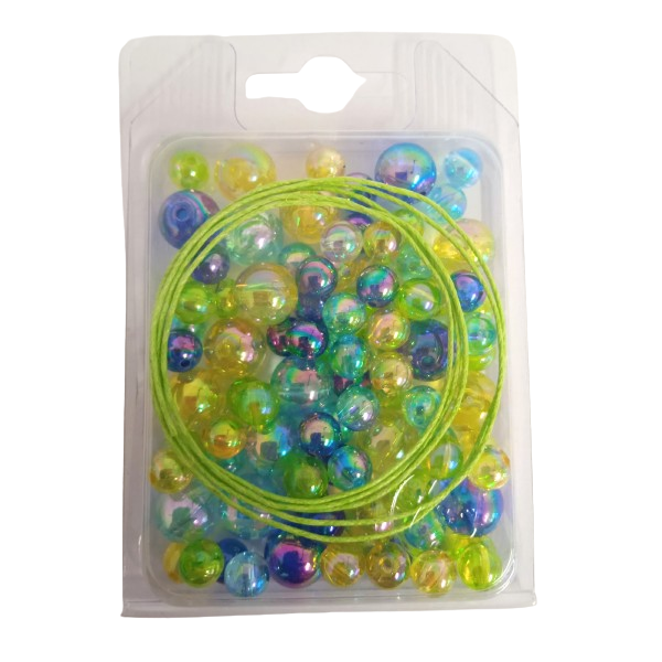 Mix plastových korálků a bavlněný provázek v průhledné krabičce, která se dá zavěsit. Obdelníková krabička:6,5x8,5x1,5 cm. Váha balení cca 35g.