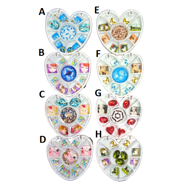 Mix skleněných kabošonů, v různých barvách, motivech i velikostech v plastové krabičce ve tvaru srdíčka. Velikost balení je cca 7,7 cm. Barvy kamenů ve zvolené kombinaci se mohou mírně lišit. Zůstává zachováno téma zvolené kombinace.