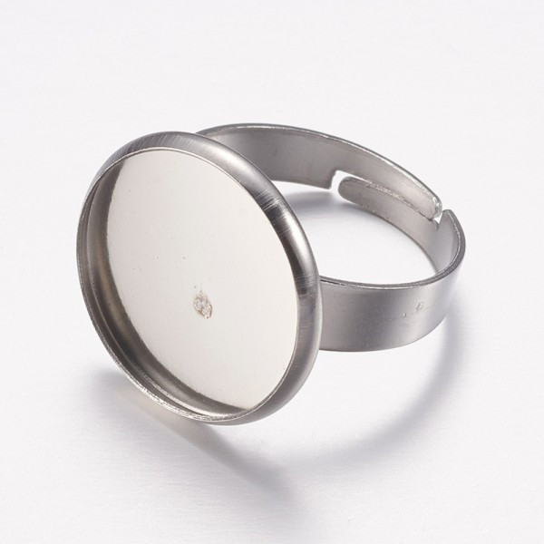 Prsten z nerezavějící oceli 304 v barvě platiny. Velikost 18 mm - velikost nastavitelná, průměr talířku je 17 mm.