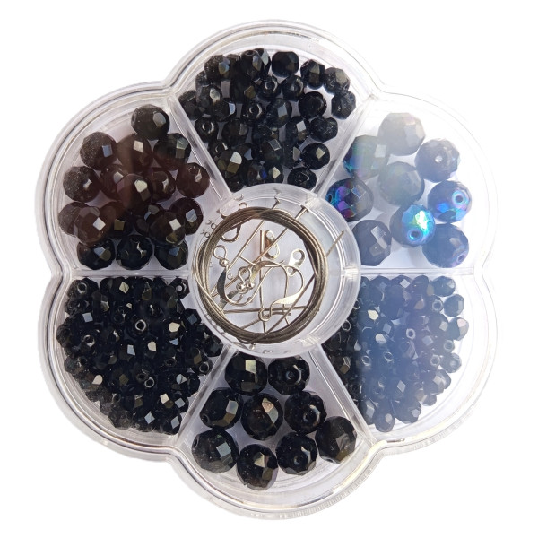 Z této korálkové tvořivé sady lze vytvořit náhrdelník nebo náramky a náušnice. Sada obsahuje: SKLENĚNÉ KORÁLKY v různých barvách a dekorech, KOVOVÉ KORÁLKY, KOVOVÉ KOMPONENTY: lanko na navlékání, karabinka, protikroužek, 4x afroháček na náušnice, 2x nýtek, zamačkávací rokaily. Průměr krabičky je cca 10,5 cm.