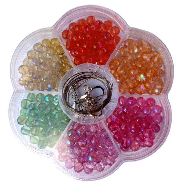 Z této korálkové tvořivé sady lze vytvořit náhrdelník nebo náramky a náušnice. Sada obsahuje: SKLENĚNÉ KORÁLKY v různých barvách a dekorech, KOVOVÉ KORÁLKY, KOVOVÉ KOMPONENTY: lanko na navlékání, karabinka, protikroužek, 4x afroháček na náušnice, 2x nýtek, zamačkávací rokaily. Průměr krabičky je cca 10,5 cm.