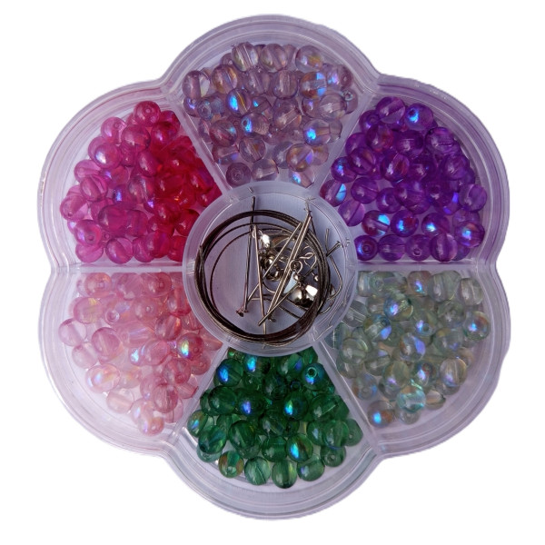 Z této korálkové tvořivé sady lze vytvořit náhrdelník nebo náramky a náušnice. Sada obsahuje: SKLENĚNÉ KORÁLKY v různých barvách a dekorech, KOVOVÉ KORÁLKY, KOVOVÉ KOMPONENTY: lanko na navlékání, karabinka, protikroužek, 4x afroháček na náušnice, 2x nýtek, zamačkávací rokaily. Průměr krabičky je cca 10,5 cm.