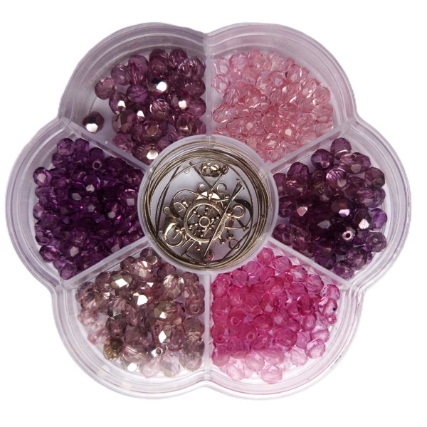 Z této korálkové tvořivé sady lze vytvořit náhrdelník nebo náramky a náušnice. Sada obsahuje: SKLENĚNÉ KORÁLKY v různých barvách a dekorech, KOVOVÉ KORÁLKY, KOVOVÉ KOMPONENTY: lanko na navlékání, karabinka, protikroužek, 4x afroháček na náušnice, 2x nýtek, zamačkávací rokaily. Průměr krabičky je cca 10,5 cm.