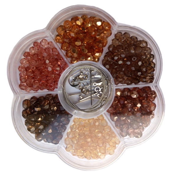 Z této korálkové tvořivé sady lze vytvořit náhrdelník nebo náramky a náušnice. Sada obsahuje: SKLENĚNÉ KORÁLKY v různých barvách a dekorech, KOVOVÉ KORÁLKY, KOVOVÉ KOMPONENTY: lanko na navlékání, karabinka, protikroužek, 4x afroháček na náušnice, 2x nýtek, zamačkávací rokaily. Průměr krabičky je cca 10,5 cm.