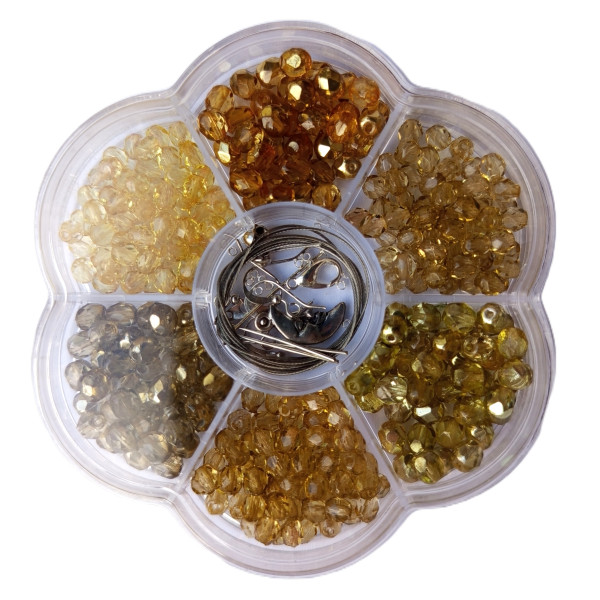 Z této korálkové tvořivé sady lze vytvořit náhrdelník nebo náramky a náušnice. Sada obsahuje: SKLENĚNÉ KORÁLKY v různých barvách a dekorech, KOVOVÉ KORÁLKY, KOVOVÉ KOMPONENTY: lanko na navlékání, karabinka, protikroužek, 4x afroháček na náušnice, 2x nýtek, zamačkávací rokaily. Průměr krabičky je cca 10,5 cm.