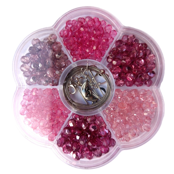 Z této korálkové tvořivé sady lze vytvořit náhrdelník nebo náramky a náušnice. Sada obsahuje: SKLENĚNÉ KORÁLKY v různých barvách a dekorech, KOVOVÉ KORÁLKY, KOVOVÉ KOMPONENTY: lanko na navlékání, karabinka, protikroužek, 4x afroháček na náušnice, 2x nýtek, zamačkávací rokaily. Průměr krabičky je cca 10,5 cm.