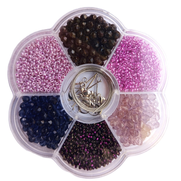 Z této korálkové tvořivé sady lze vytvořit náhrdelník nebo náramky a náušnice. Sada obsahuje: SKLENĚNÉ KORÁLKY v různých barvách a dekorech, KOVOVÉ KORÁLKY, KOVOVÉ KOMPONENTY: lanko na navlékání, karabinka, protikroužek, 4x afroháček na náušnice, 2x nýtek, zamačkávací rokaily. Průměr krabičky je cca 10,5 cm.