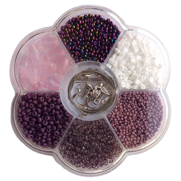 Z této korálkové tvořivé sady lze vytvořit náhrdelník nebo náramky a náušnice. Sada obsahuje: SKLENĚNÉ KORÁLKY v různých barvách a dekorech, KOVOVÉ KORÁLKY, KOVOVÉ KOMPONENTY: lanko na navlékání, karabinka, protikroužek, 4x afroháček na náušnice, 2x nýtek, zamačkávací rokaily. Průměr krabičky je cca 10,5 cm.