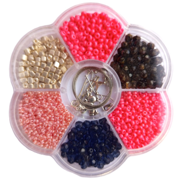 Z této korálkové tvořivé sady lze vytvořit náhrdelník nebo náramky a náušnice. Sada obsahuje: SKLENĚNÉ KORÁLKY v různých barvách a dekorech, KOVOVÉ KORÁLKY, KOVOVÉ KOMPONENTY: lanko na navlékání, karabinka, protikroužek, 4x afroháček na náušnice, 2x nýtek, zamačkávací rokaily. Průměr krabičky je cca 10,5 cm.