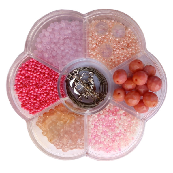 Z této korálkové tvořivé sady lze vytvořit náhrdelník nebo náramky a náušnice. Sada obsahuje: SKLENĚNÉ KORÁLKY v různých barvách a dekorech, KOVOVÉ KORÁLKY, KOVOVÉ KOMPONENTY: lanko na navlékání, karabinka, protikroužek, 4x afroháček na náušnice, 2x nýtek, zamačkávací rokaily. Průměr krabičky je cca 10,5 cm.