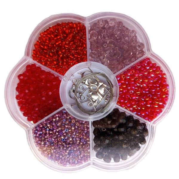 Z této korálkové tvořivé sady lze vytvořit náhrdelník nebo náramky a náušnice. Sada obsahuje: SKLENĚNÉ KORÁLKY v různých barvách a dekorech, KOVOVÉ KORÁLKY, KOVOVÉ KOMPONENTY: lanko na navlékání, karabinka, protikroužek, 4x afroháček na náušnice, 2x nýtek, zamačkávací rokaily. Průměr krabičky je cca 10,5 cm.
