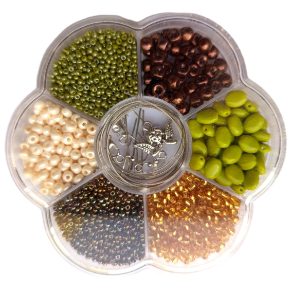 Z této korálkové tvořivé sady lze vytvořit náhrdelník nebo náramky a náušnice. Sada obsahuje: SKLENĚNÉ KORÁLKY v různých barvách a dekorech, KOVOVÉ KORÁLKY, KOVOVÉ KOMPONENTY: lanko na navlékání, karabinka, protikroužek, 4x afroháček na náušnice, 2x nýtek, zamačkávací rokaily. Průměr krabičky je cca 10,5 cm.