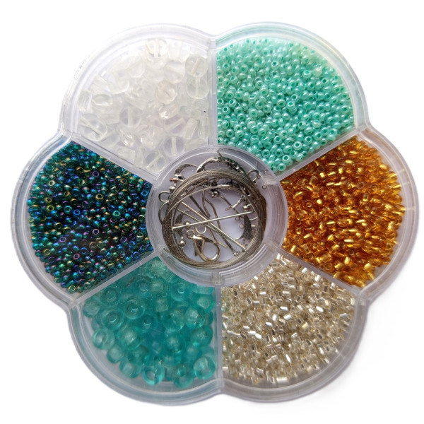 Z této korálkové tvořivé sady lze vytvořit náhrdelník nebo náramky a náušnice. Sada obsahuje: SKLENĚNÉ KORÁLKY v různých barvách a dekorech, KOVOVÉ KORÁLKY, KOVOVÉ KOMPONENTY: lanko na navlékání, karabinka, protikroužek, 4x afroháček na náušnice, 2x nýtek, zamačkávací rokaily. Průměr krabičky je cca 10,5 cm.